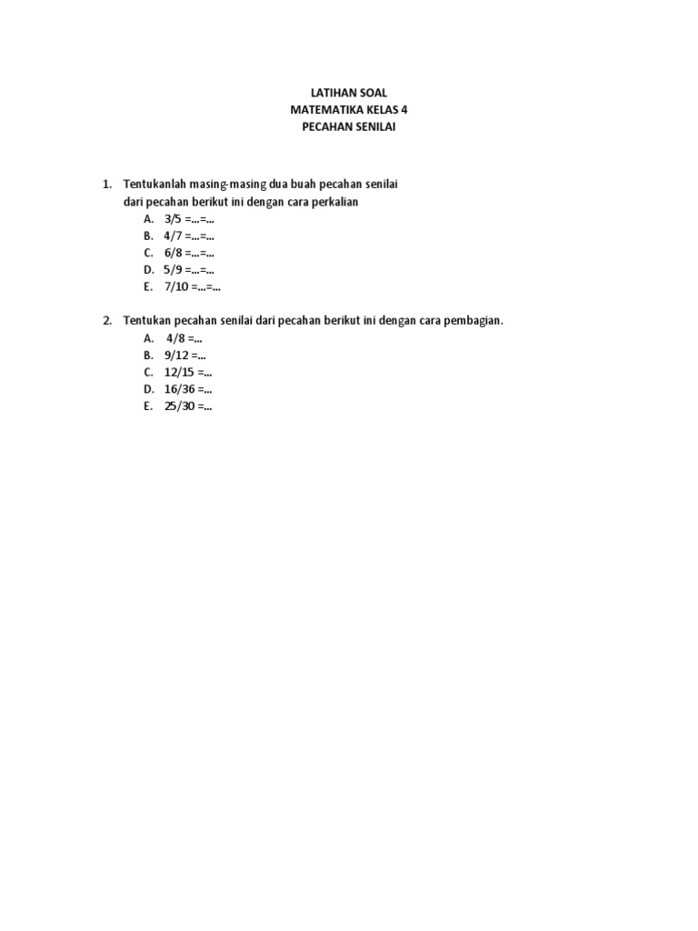 Contoh soal matematika kelas 4 sd tentang pecahan senilai, kali ini kami akan bagikan kumpulan latihan soal pelajaran matematika untuk kelas 4 sd pada semester 1 tentang pecahan senilai. Latihan ulangan matematika kelas 4 sd skl : Sahabat matematika dasar yang selalu bersemangat dan selalu ceria materi pecahan di kelas 4 sd dibagi lagi menjadi beberapa sub bab yakni. Matematika kelas 4 pecahanmatematika kelas 4 pecahan senilaimatematika kelas 4 pecahan bilangan pecahanmatematika kelas 4 pecahan sederhanamatematika pecahan. Iv (empat) semester i (satu) disusun oleh : Materi pecahan senilai berhubungan dengan konsep perbandingan, rasio, dan operasi hitung. Rangkuman dan soal operasi hitung pecahan materi belajar dari rumah tvri kelas 4 6 sd semua halaman bobo. Live worksheets > indonesian > matematika > pecahan > lkpd pecahan kelas 4 sd. Tulislah pecahan senilai dari :.soal uts matematika kelas 4 sd semester genap. đź’—untuk memahami tentang pecahan senilai, tiga kegiatan yang dapat dilakukan adalah menggunakan garis bilangan, menggunakan. Pecahan senilai silabus matematika tahun pelajaran 2018/2019 nama sekolah : 2 anak tidak masuk = 2/30=1/15 bagian. Selamat pagi, anak sholeh dan sholehah.